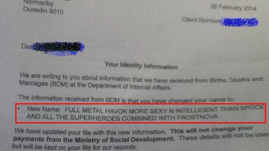 Ranije ove godine, nakon što je izgubio opkladu na pokeru, jedan Novozelanđanin je legalno promijenio ime u Full Metal Havok More Sexy N Intelligent Than Spock And All The Superheroes Combined With Frostnova. Ime od 99 znakova je zamalo odbijeno s obzirom da je na Novom Zelandu zakonsko ograničenje za imena 100 znakova.